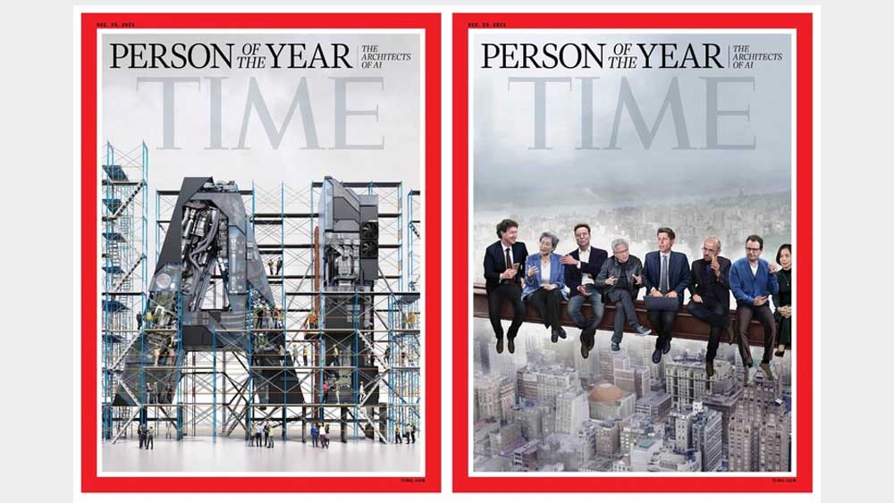 A rendere concreto questo cambiamento sono gli uomini e le donne che progettano e guidano l’IA. Le due copertine di Time raffigurano figure simbolo come Mark Zuckerberg, Lisa Su, Elon Musk, Jensen Huang, Sam Altman, Demis Hassabis, Dario Amodei e Fei-Fei Li. Ritratti come operai su una trave d’acciaio o immersi in una struttura che richiama le lettere A e I, questi protagonisti incarnano l’idea di una nuova costruzione collettiva, simile a quella dei primi grattacieli del Novecento, ma fatta di codice e visione.